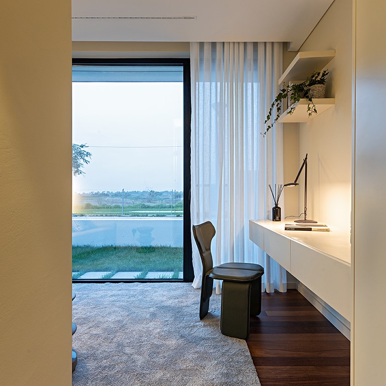 As caixilharias Cortizo, série Cor Vision, com rutura de ponte térmica e pé direito total, oferecem um design minimalista e funcional, garantindo um excelente desempenho térmico e acústico. As suas amplas janelas de correr permitem uma ligação fluida entre o interior e o exterior, maximizando a entrada de luz natural e proporcionando uma sensação de amplitude e sofisticação aos espaços.